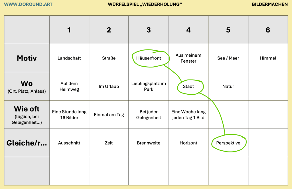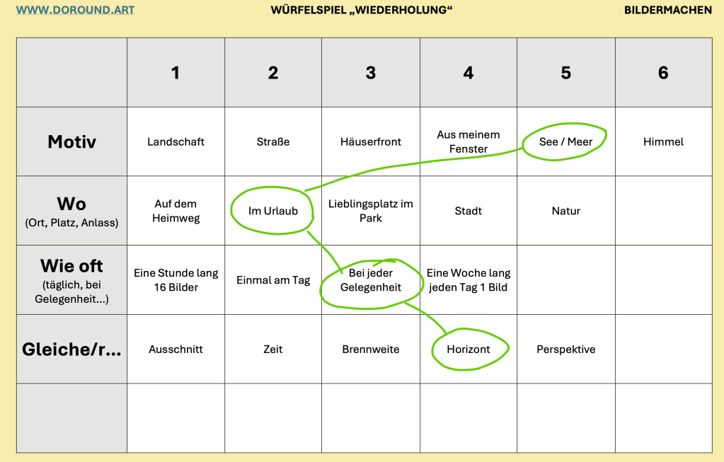 Überlasse es dem Zufall durch den Würfel oder wähle sehr bewußt eine Kombination aus, die Deine Rahmenbedingungen für die Fotoaufgabe sein dürfen.