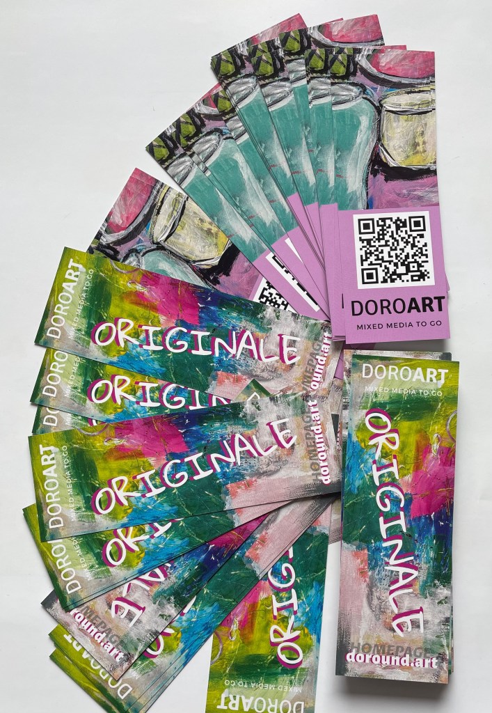 Hurra, die letzten Teile für meine Präsentation an meinem Stand sind eingetrudelt. Ich habe eine Art Lesezeichen gewählt, glänzend damit die Farben leuchten. Diese „Visitenkarte“ zeigt meine abstrakte Seite und meine Vorliebe für Stillleben – also Ausschnitte aus zwei meiner Werke.