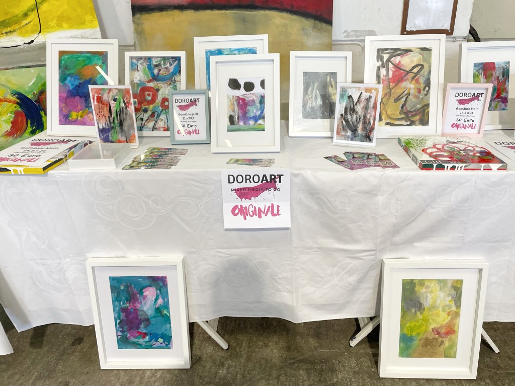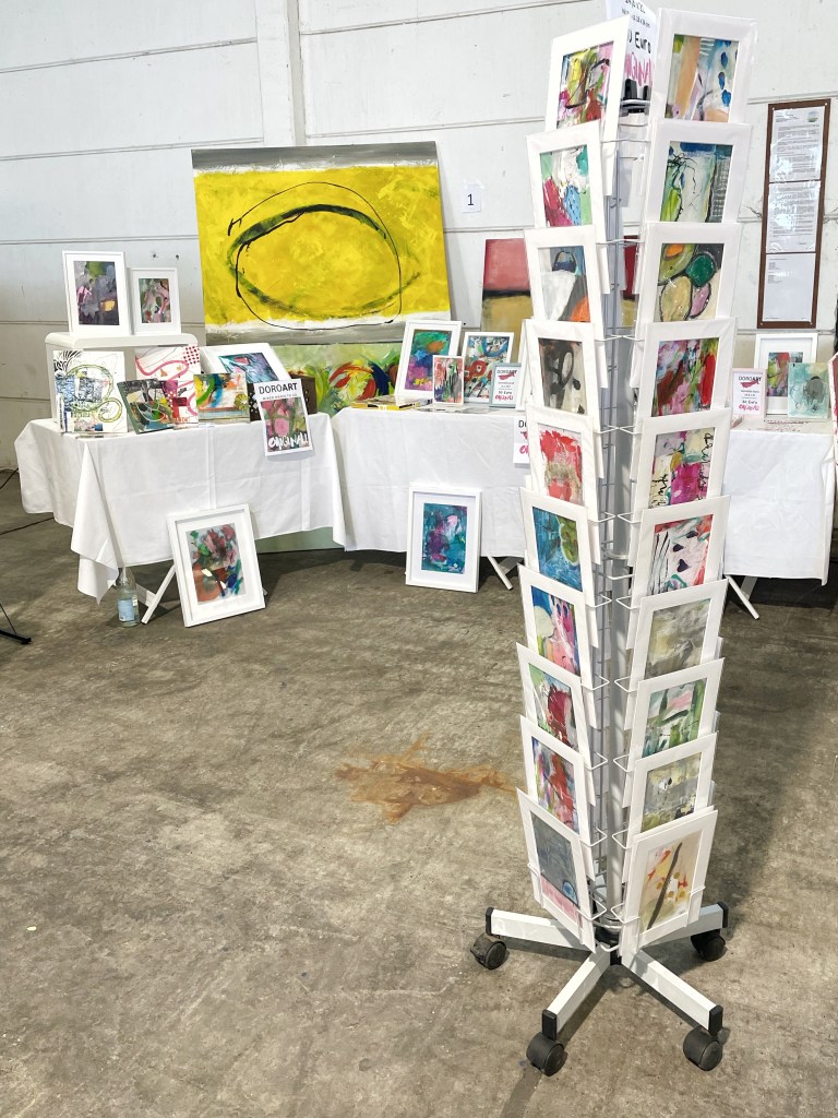 Richtig, Ausstellung, am Ende sah es aus wie eine Ausstellung und ich durfte mich und meine Arbeiten den Besucher*Innen präsentieren. Ich weiß, dass mein „Stand“ etwas anderes war. Abstrakte Kunst wurde an diesem Tag beim Hobby- und Kreativmarkt in Weener nur von mir angeboten. Ein Alleinstellungsmerkmal.