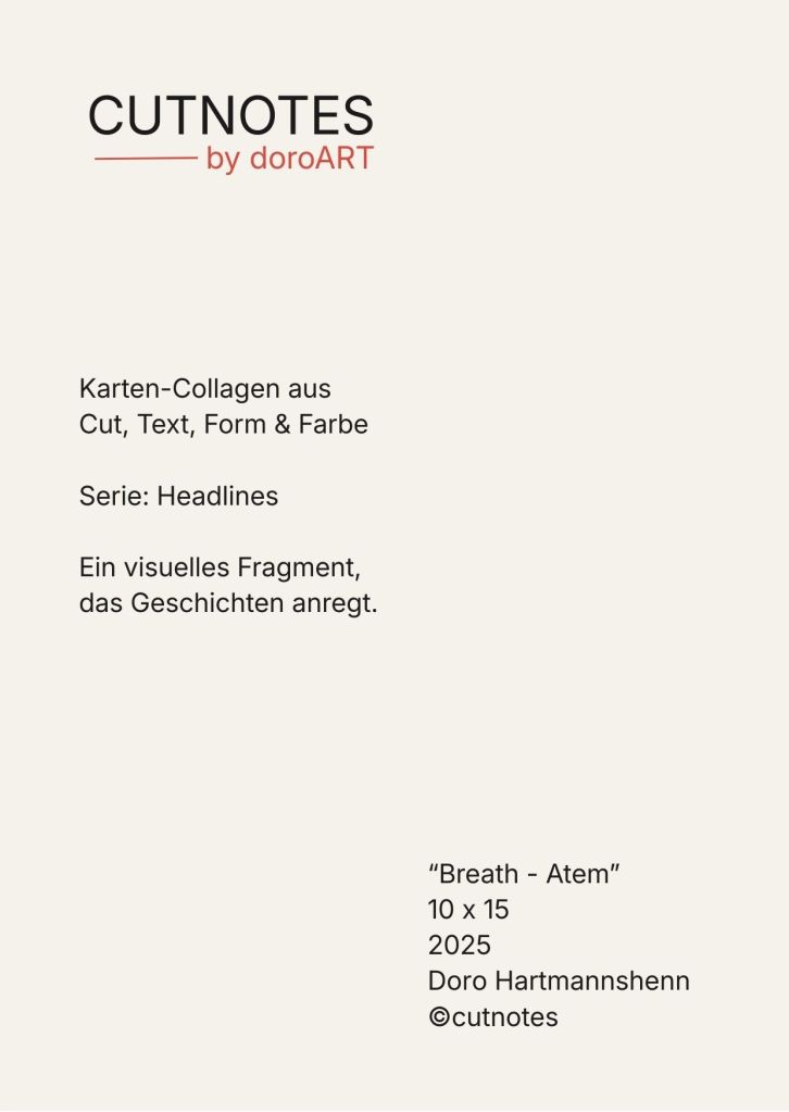 CutNotes entstand aus meinen Stimmungstafeln und aus dem Bedürfnis, Momente in ihrem Facettenreichtum zu entwickeln, nicht als glatte Bilder, sondern als Zusammensetzung aus Bild und Farbmaterial mit Wortfetzen, Headlines. Ergänzt werden sie mit den dadurch angestoßenen Geschichten, die jeder Mensch in sich trägt. Somit ist die BetrachterIn Teil des Werkes, mit Auge, Erfahrung, Erinnerung und Gedanke findet das Werk Resonanz.